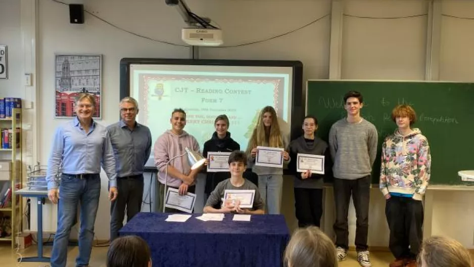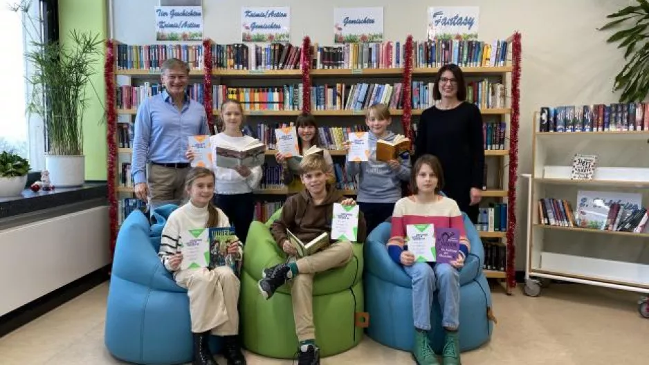 Während vor dem Fenster leise der Schnee rieselte, herrschte Aufregung im Klassenzimmer DE03, dem Ort des diesjährigen Vorlesewettbewerbs. Alle Klassensieger*innen der 6. Jahrgangsstufe traten am 1.12.2023 beim Schulentscheid gegeneinander an. Die Rollen von Jury und Publikum sowie die Moderation übernahmen die Schüler*innen des Q11-Deutschkurses von Frau Gebhardt. Florentine Weinzierl (6a) startete den Wettbewerb und trug sicher eine witzige Textpassage aus dem Buch „Luzifer Junior – Ein höllischer Tausch“ von Jochen Till vor. In der Geschichte geht es um die Teufelskinder Luzifer und Lilly…