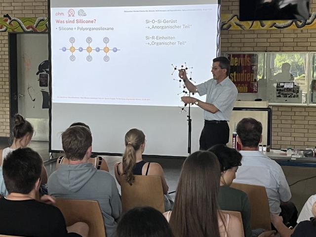 Mit vielseitigem Anschauungsmaterial informierte er bei sehr reger Beteiligung von Schülern, Lehrern, Eltern und Gästen über den vielseitigen Werkstoff Silikon, seine Vor- und seine Nachteile. Silikon wird in den unterschiedlichsten Bereichen wie in der Medizin, Kosmetik, im Bauwesen, in der Landwirtschaft, Raumfahrt, Nahrungsmittelindustrie und vielen weiteren Bereichen eingesetzt und ist in unserem heutigen Leben nicht mehr wegzudenken. Es birgt viele Vorteile wie Hitzestabilität, Langlebigkeit, Widerstandsfähigkeit. Leider hat es jedoch einen großen Nachteil: Silikon ist in den meisten Formen bisher so gut wie nicht abbaubar und recyclebar und reichert sich überall in der Umwelt an.