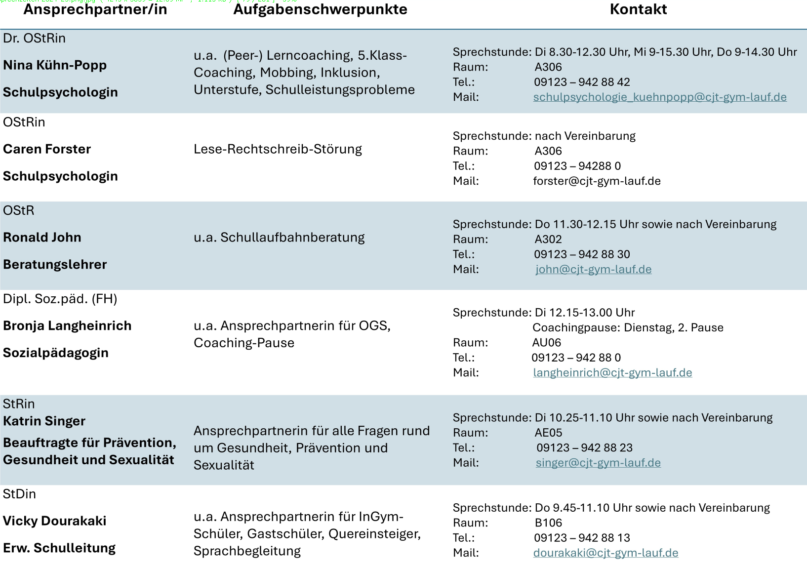 - Kathrin Wittmann: Schülerangelegenheiten Oberstufe, Förderverein (Raum B 107)